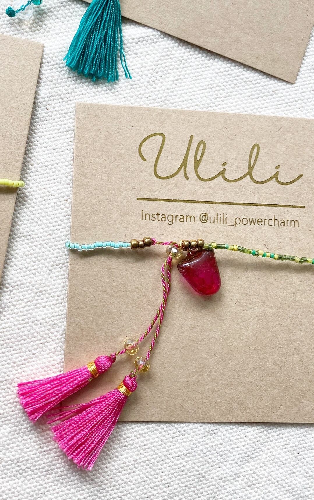 人気のビーズブレスレットカラーにアメジストのようは深い赤紫のPOWER CHARMを合わせました。