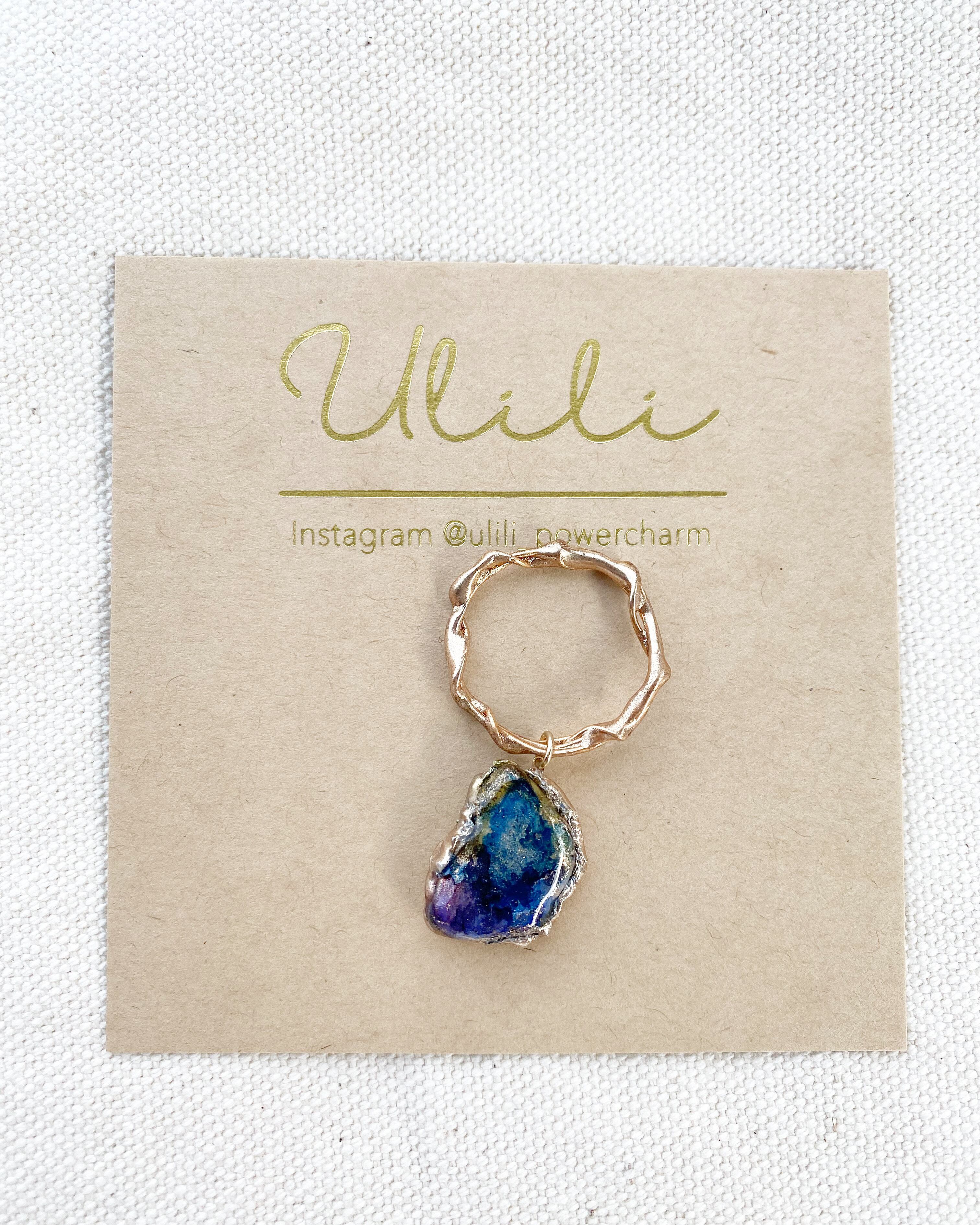 リースのようなリングに地球色のPOWER CHARMを合わせました。手の甲で揺れるデザインです。